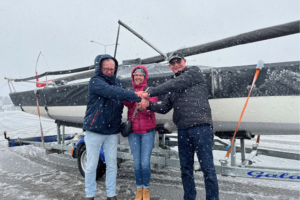 I sne og slud kommer LSK ud. Klubbens nye J/70 blev hentet i Flensburg. Gert og David har været tidlig afsted fra Sjælland og hentet båden hjem. Båden står lige nu hos David i Ølsted og venter på at traileren kan blive synet.